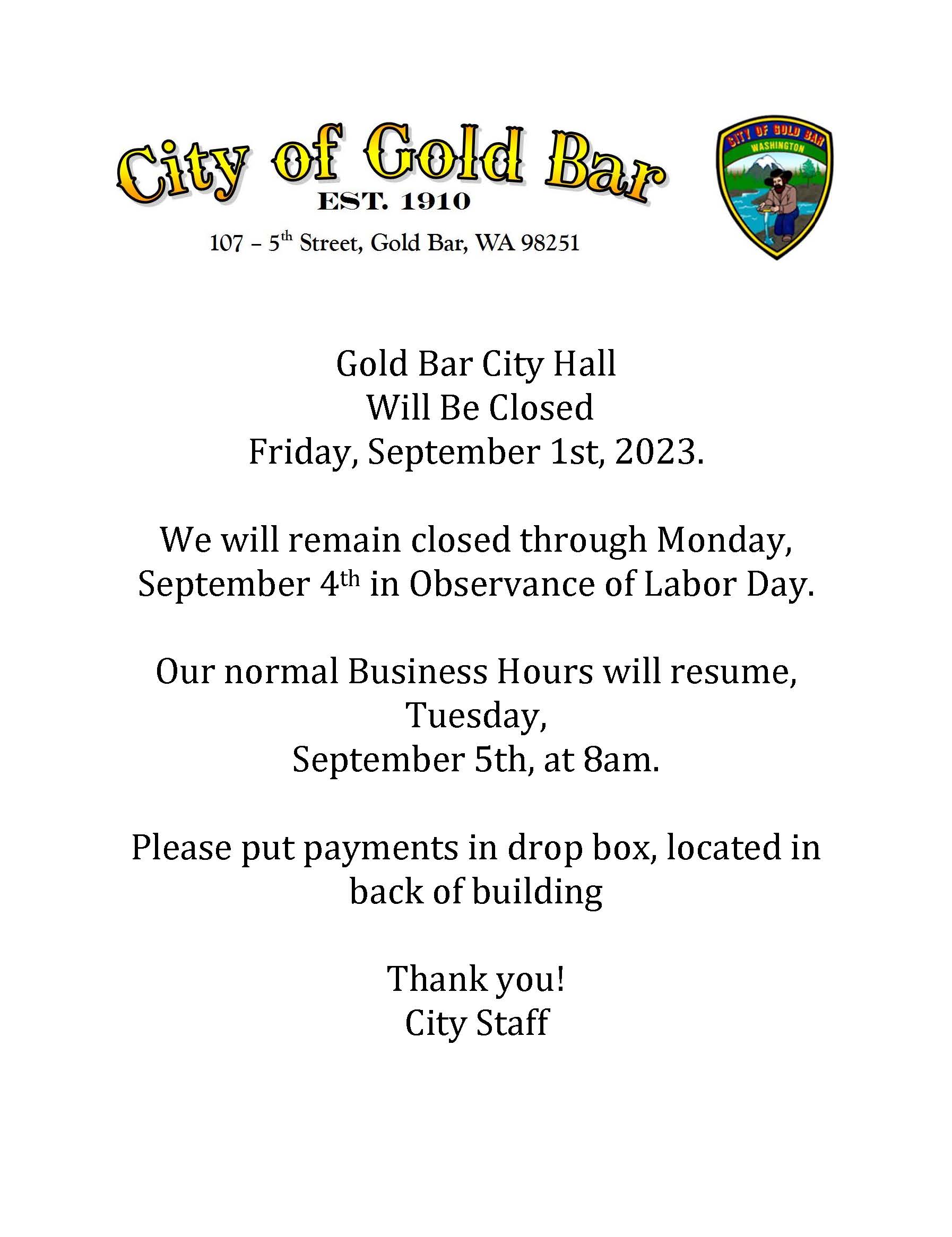 City Hall Closed for Holiday Notice_Closing early Friday for Labor Day2023