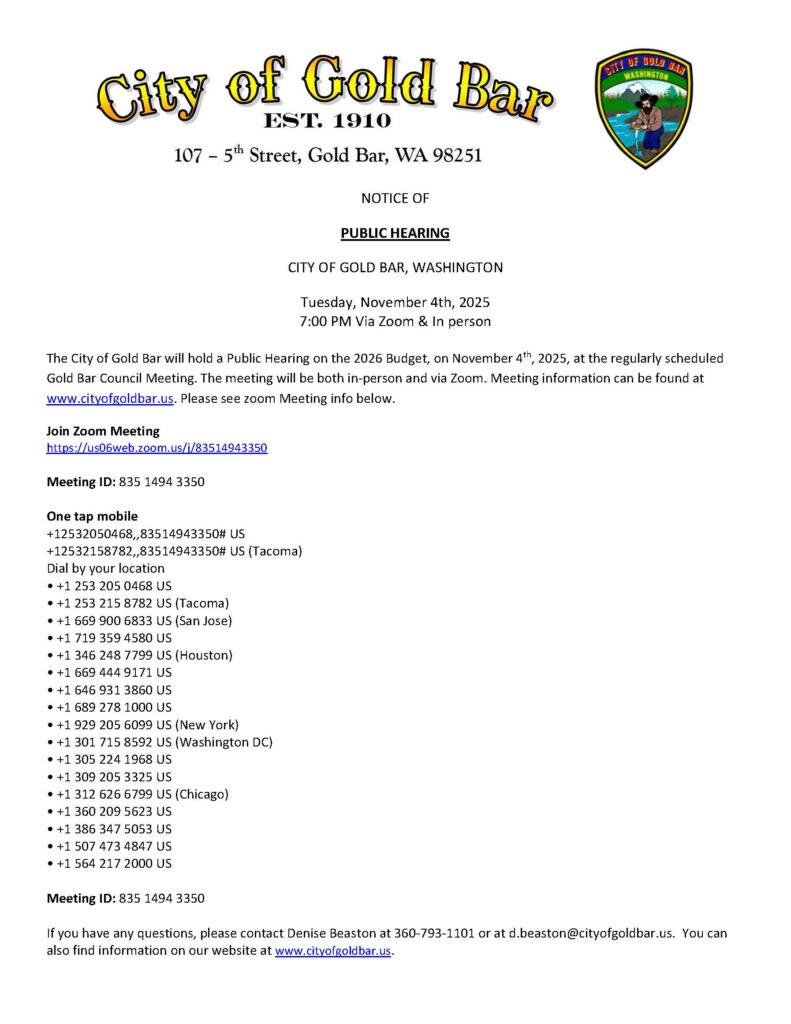Public Hearing Notice For City of Gold Bar Council Meeting on Tuesday, November 4th 2025